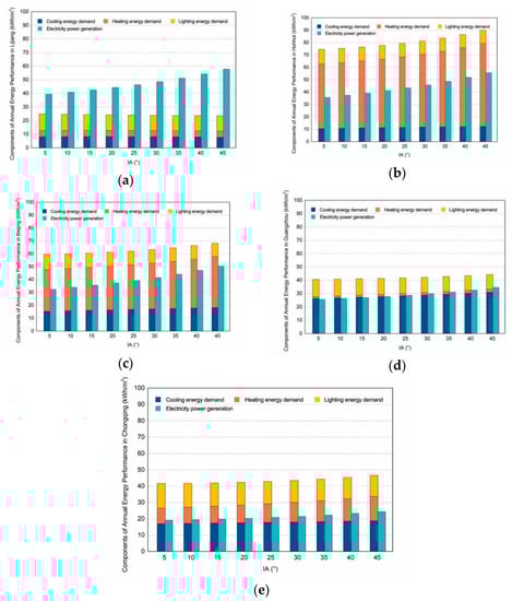 Energy performance of STPV skylights integrated into sloped roofs. (a) Case 1: Lijiang; (b) Case 2: Hohhot; (c) Case 3: Beijing; (d) Case 4: Guangzhou; (e) Case 5: Chongqing.
