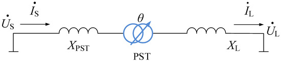 It can be concluded from Equation (1) that PST will add a phase angle of ±θ to the active power transmitted by the line. When the phase shift angle of PST output is positive, the phase difference between the head and end of the line is reduced, so as to reduce the line active power flow. On the contrary, if the PST output phase shift angle is negative, the line transmission power can be increased.