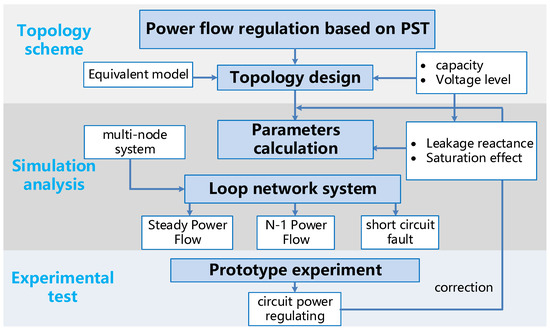 In this paper, PST is proposed to solve the power flow problem of high-voltage power grid. The steps and work of this method are shown in Figure 2. It is generally divided into the research process of theoretical analysis, simulation calculation, and experimental verification. In topology selection and parameter calculation, the actual power grid demand should be combined, and the influence of leakage reactance and saturation effect should be considered.