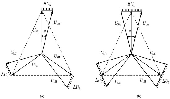 The asymmetric PST changes the voltage amplitude and phase angle simultaneously. Symmetric PST ensures that the voltage amplitude is unchanged before and after compensation and only changes its phase angle [26,27]. The asymmetric and symmetric PST voltage phasor is shown in Figure 4.