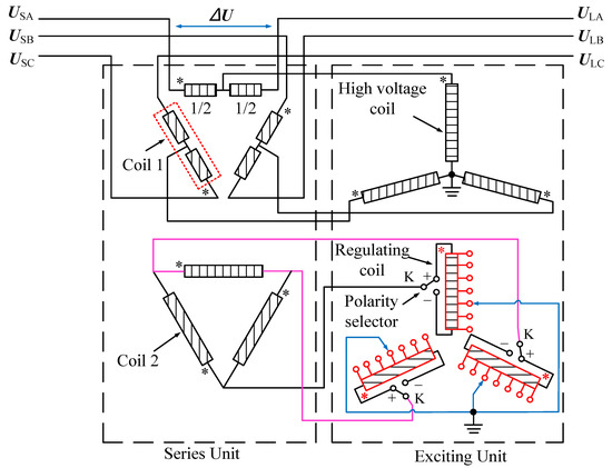 References [12,13,14,15] summarize the engineering application of PST, and PST on-load voltage regulating switches can be divided into mechanical type and thyristor type. In current engineering applications, the mechanical on-load voltage regulating switch is more widely used, and studies on the thyristor PST are mostly on theory and simulation. References [16,17,18] describes the research status of PST and analyzes the advantages and disadvantages of different types of PST and their application scenarios: The thyristor PST has a faster response speed and is suitable for situations requiring a fast dynamic response and a small capacity, but its cost is much higher than that of a mechanical PST. The mechanical switch is suitable for the occasions where the response speed is not high, and the capacity is large. Reference [19] improved the structure of the traditional mechanical PST and proposed a new electromagnetic unified power flow controller (EUPFC), which has a larger adjustment range and a faster response speed than the traditional PST. However, this structure is mostly used for power grids below 110 kV, and its insulation cost will increase significantly when it is applied to high-voltage power grids above 220 kV. Reference [20] analyzed the feasibility of double core symmetric PST to improve steady-state power flow in actual power grid and conducted a simulation study on the control characteristics of PST during switching operation.
