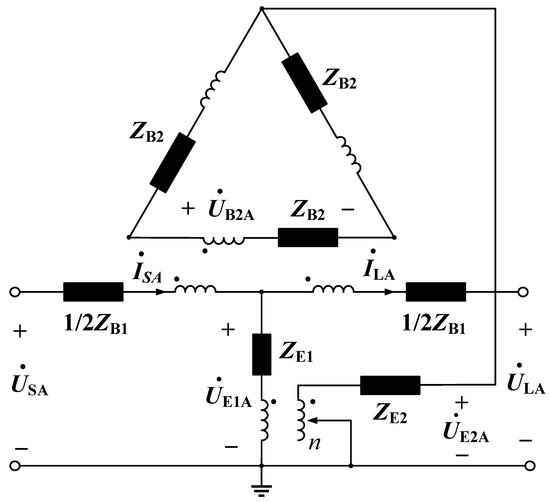 Under load conditions, the output phase shift angle θ of PST is determined jointly by its no-load phase shift angle α and internal phase shift angle β, which affects not only the structure and winding size of transformer but also the selection of tap switch. The primary and secondary sides of ET are star-shaped wiring, and the midpoint of BT primary side winding leads to the primary side of ET, so the first and secondary sides are divided into two parts with equal equivalent impedance [28]. The voltage in the voltage regulating coil can be changed by adjusting the tap position of the on-load voltage regulating coil on the secondary side of ET so as to generate compensation voltage on the primary side of BT and realize the voltage phase shift between the power side and the load side of the line. Double core symmetrical PST three phase equilibrium establishes its A-phase equivalent circuit, as shown in Figure 6.