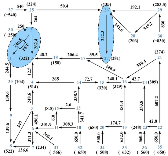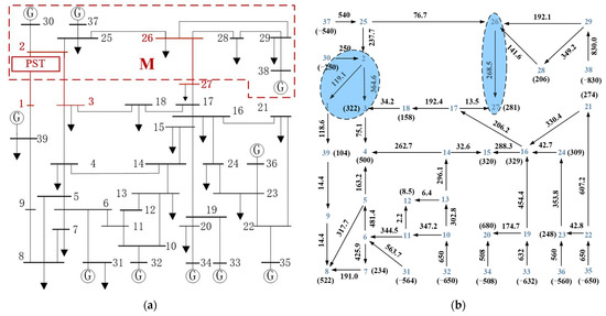 Initial power flow of IEEE39 nodes. (a) PST location diagram, (b) Initial power flow distribution diagram.