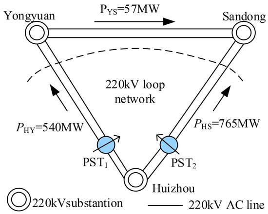 Figure 10 shows the transmission line power flow of the 220 kV loop network of Huizhou–Sandong–Yongyuan of the Guangdong Power Grid. The transmission limit of the Huizhou–Yongyuan transmission line is restricted by the Huizhou–Sandong transmission line. When the load of The Huizhou–Sandong double circuit line is full, the load rate of the Huizhou–Yongyuan line is about 60%, and the transmission limit of the Huizhou–Sandong and Yongyuan section is 1305 MW. According to the research, PST can be installed at the head of Huizhou–Yongyuan line and the head of the Huizhou-Sandong line.