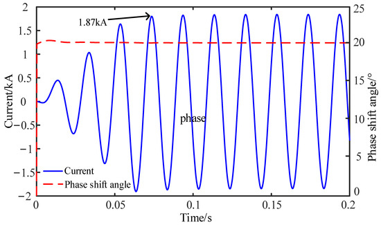 Considering the influence of the impedance of PST, simulation software is used to verify parameters of the designed PST. When the voltage at the head of line reaches the rated value, the line current and the output phase shift angle are measured, and the results are shown in Figure 12.