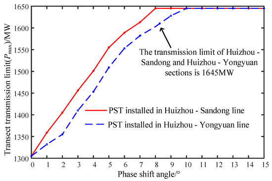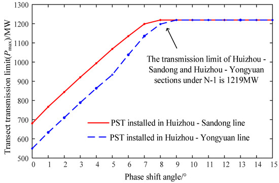 From Figure 14, when PST is installed on Hui–Sandong A line, the transmission limit of the Huizhou–Sandongjia and Huizhou–Yongyuan sections reaches 1219 MW when θ = 8°, and the load of the three transmission channels (The Huizhou–Sandong A line and the Huizhou–Yongyuan double loop line) are close to full. When the PST is installed on the Line A of Huizhou–Yongyuan, the transmission limit of the section reaches 1219 MW when θ = 9°.