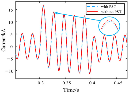 Single phase short circuit occurs most frequently in a high voltage system, generally accounting for about 70%. It is set that phase a grounding short circuit fault occurs in the system at 0.3 s, and the fault is removed at 0.4 s. The line short-circuit current with and without PST is shown in Figure 15.