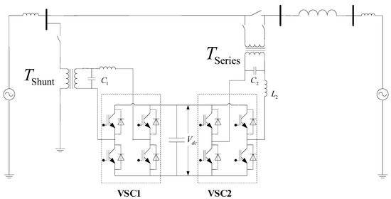 The topology of UPFC (unified power flow controller) is shown in Figure 17. It is mainly composed of three main modules: series transformer (TSeries), parallel transformer (TShunt), and MMC (VSC1 and VSC2). UPFC is the most comprehensive facts device, including all the capabilities of voltage regulation, series compensation, and phase shifting control.