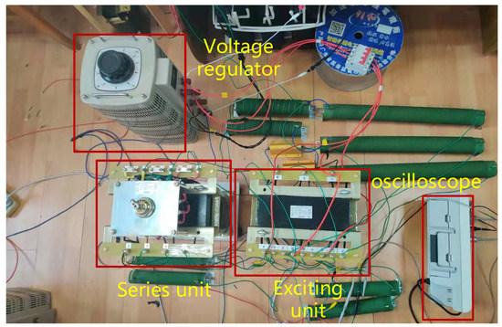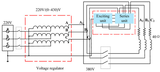 On the basis of theoretical analysis and simulation verification, a 380 V (±4 gear) prototype is designed and manufactured for experimental verification of its power flow regulation performance. The experimental schematic diagram is shown in Figure 18. The three-phase power line used in the experiment platform has a voltage of 380 V and a frequency of 50 Hz. The three-phase power supply is adjusted by a voltage regulator of 220 V/(0~430)V to obtain the system’s head voltage of 220 V phase voltage.