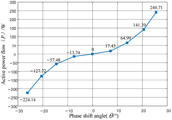 The variation of line transmission power with the phase shift angle of PST output is shown in Figure 20. We can conclude from the experimental results that the designed PST phase shift angle ranges from −25.5° to 26.17°. The adjustment range of P is −224.12 W~240.17 W by changing the angle of phase shift.