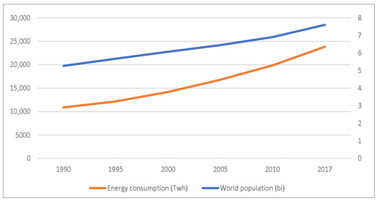 Global population (billion) and energy consumption (TWh) by year (1990–2017), derived from [19].