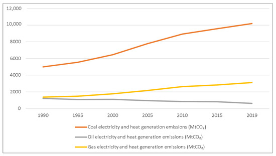 Global CO2 emissions (MTCO2) from electricity and heat by energy sources and year (1990–2019), derived from [19].