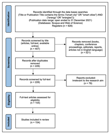 In the second stage, the study conducted a systematic literature review by following the PRISMA protocol. In this step, the materials were collected from the selected search bases, for which the keywords gave rise to the search expression (Title or Publication Title contains the terms (“smart city” OR “smart cities”) AND (“energy” OR “energies”)). For the collection of materials, the authors did not establish an initial date so that all materials published until 31 December 2021, were collected. The results of this search were tabulated; this initial sample contained 928 documents. After removing documents duplicated, in languages other than English, and non-academic documents, a sample of 226 articles was identified. The abstracts of the articles in this sample were read to separate only the articles that had elements capable of contributing to the answer to the guiding question according to the criteria in Table 2.