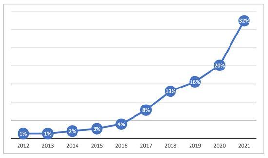 The research showed that despite being a relatively new topic, it continues to proliferate in academia, showing a scientific drive to seek solutions and innovation in the energy sustainability sector in cities. The initially selected literature pieces contained 928 documents. After applying the inclusion and exclusion criteria, a final list was created containing 154 articles in English published in scientific journals for analysis. The final list showed that 81% of the studies on energy sustainability in smart cities were published in the last four years (13% in 2018, 16% in 2019, 20% in 2020, and 32% in 2021). It was also notable that in 2012, there were two publications on the topic and that the cumulative distribution of these publications until the end of 2016 was only 11%, as shown in Figure 4.