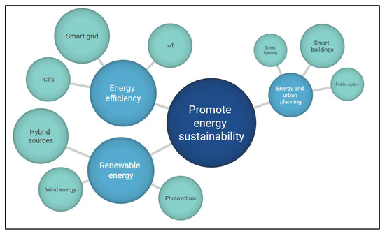 The “Energy and urban planning” category was the third identified and consisted of planning, management, creation, and development of public policies, actions, and strategies focused on the development of urban energy sustainability [40,41,71].