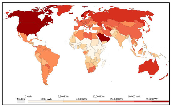 Per capita global energy consumption (kWh) in 2019, derived from [19].