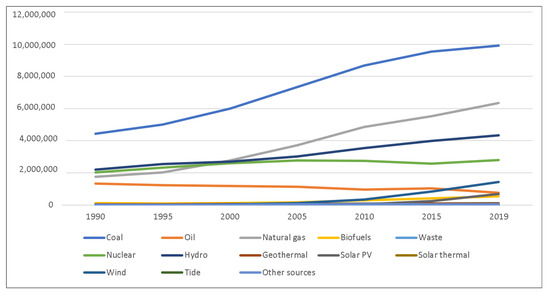 Global electricity generation by source (GWh) and year (1990–2019), derived from [19].