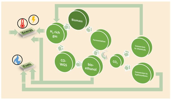At present, a significant challenge in which the chemical and allied industries are involved can be identified: the transition to greener, more sustainable manufacturing processes that efficiently use raw materials [8]. This transition can be realized if the traditional concepts of process efficiency, focusing on chemical yield, are replaced by approaches in which the main importance is assigned to replacing fossil resources (oil, coal, and natural gas) with renewable raw materials. In this way, the targets of limiting waste and avoiding the use of toxic and/or hazardous substances may also be reached [9]. Another attractive approach is the valorization of waste biomass, which is currently incinerated or goes to the landfill [10]. The bio-based economy involves cross-disciplinary research at the interface of biotechnology and chemical engineering, focusing on the development of green, chemo- and biocatalytic technologies for waste biomass conversion to biofuels, chemicals, and bio-based materials [11]. In particular, the utilization of biomass impacts different fields. On the one hand, biomass fermentation allows the obtainment of fuels such as bioethanol, which can be employed as such or can be further valorized by its subsequent conversion into hydrogen, which is widely seen as the energy vector of the future. On the other hand, bioethanol is not the only product of biomass fermentation; indeed, a considerable amount of CO2 is contextually generated. Therefore, green chemistry cannot limit its actions to the obtainment and conversion of bioethanol but should also be capable of utilizing the produced carbon dioxide in order to be a carbon-free technology. Carbon dioxide utilization is a newborn topic in the research context, but the widely shared ideal is its catalytic conversion into hydrocarbons and alcohol, mainly through hydrogenation reactions. The obtained products can be further employed as chemicals and/or as fuels. Hence, starting from the fermentation of waste biomass, it is possible to obtain two valuable components: bioethanol, which can be upgraded to green hydrogen through reforming and water–gas shift processes, and carbon dioxide, which can be converted into substitute natural gas, other green fuels, or alcohols via hydrogenation. A schematic representation of the discussed connections among processes is displayed in Figure 2.