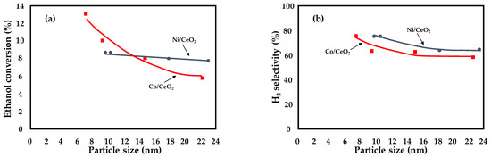 Catalytic performance of Co- and Ni-supported CeO2 samples as a function of the metal particle size. Adapted from [27]; T = 420 °C; P = 1 atm; H2O/C2H5OH = 12; GHSV = 1,286,000 mL·g−1 h−1. (a) ethanol conversion and (b) H2 selectivity vs metals particle size.