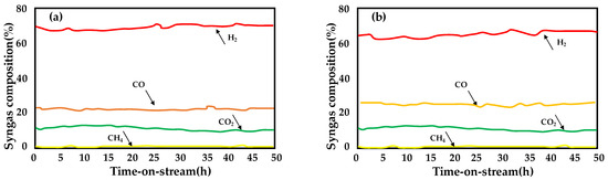 Syngas composition obtained over a monolith washcoated with Rh–Pt/CeO2–SiO2 using (a) synthetic bioethanol and (b) actual bioethanol obtained from glucose standards. Adapted from [21]; T = 700 °C; P = 1 atm; H2O/C2H5OH = 3; SV = 0.17 gethanol·gcat−1 min−1.