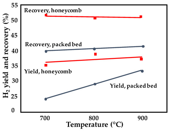 Another interesting alternative for the intensification of the bioethanol reforming process is the integration of the chemical reaction with other types of unit operations in a single unit (i.e., integration of reactor and separation steps through a H2-permselective membrane). For example, ethanol steam reforming was recently investigated at 600 °C, P = 13 atm, and H2O/C2H5OH = 6 over an Ir/CeO2 catalyst in the presence of Pd and PdCu membranes prepared by a multi-layer electroless plating method and deposited on porous ceramic tubes [50]. In both cases, the hydrogen yield and the recovery factor remained stable for 10 days of continuous operation. However, the purity of the permeated H2 was reduced from 97% to 91% in the Cu-free membrane reformer, while a stable value of 98% was recorded when using the PdCu membrane, demonstrating that copper addition prevents leaking phenomena. Eremeev et al. [51] studied the performance of a catalytic reactor provided with a membrane made of a thin Ni–Cu alloy–Nd tungstate nanocomposite dense permselective layer deposited on a Ni–Al hierarchically structured asymmetric foam substrate. The catalyst (Ni + Ru/Pr0.35Ce0.35Zr0.35O) was tested in a packed-bed configuration as well as after deposition on a honeycomb Fechralloy substrate. The influence of introducing a structured catalyst instead of the packed bed in the membrane reactor is depicted in Figure 5 as a function of the reaction temperature. When the monolith was selected, better performance was measured in terms of both H2 yield and recovery due to the very high and stable catalytic activity recorded between 700 and 900 °C.