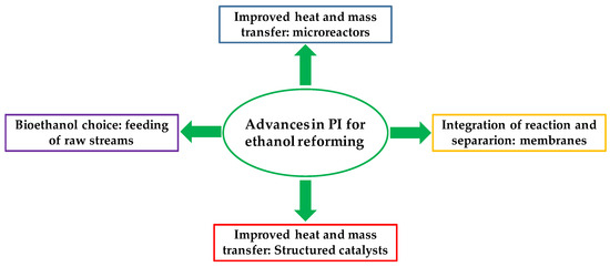 Figure 6 summarizes the recent approaches implemented in the context of the ER intensification process. Due to the reaction endothermicity, the use of systems with enhanced heat transfer appears to be a promising alternative; moreover, the increase in mass transfer coefficients (obtained by microreactors of structured catalytic carriers) was shown to significantly improve catalyst activity and stability. The use of raw feeds instead of a pure water/ethanol mixture, highly desired to decrease the feedstock pre-treatment costs, was found to have a minor impact on the performance of CO2–SiO2-based catalysts [21,49]. Finally, the utilization of a H2-permselective membrane combined with structured catalysts was identified as a viable route towards feasible hydrogen production from ethanol [51].