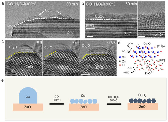 Experimental and theoretical calculations have shown that ZnO–Cu catalysts undergo Cu restructuring in situ during the WGS reaction, forming the active sites of a CuCu(100)-hydroxylated ZnO ensemble [60]. The structural evolution of model Cu/ZnO catalysts during the LTS reaction was also studied through in situ transmission electron microscopy, demonstrating the dynamic nature of the atomic structures of Cu/ZnO catalysts [61]. The study showed that upon CO exposure, the Cu nanoparticles decompose and redistribute on the ZnO surface; the Cu species wet the ZnO surface to give either a defected CuOx phase or crystalline Cu2O (Figure 7), and ZnO clusters precipitate on Cu nanoparticles and cover the Cu surface with a defected ZnOx phase. Moreover, a mixed phase of CuOx–ZnOx with an empty shell structure is present.