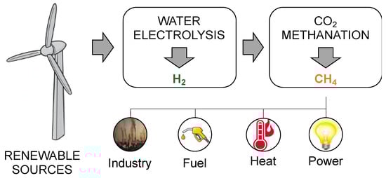 The hydrogenation of CO2 to generate HC fuels involves two routes (i.e., direct and indirect routes), which are often referred to as the chemical process. The goal of producing methane and subsequent long-chain HC is the basis for the conversion of CO2 into HC fuels. Therefore, in the energy-related scenario, the CO2 methanation reaction has acquired remarkable interest in recent years. Indeed, it constitutes the core of the power-to-methane (PtM) process chain. This recently developed technology involves a stepwise conversion, which aims to efficiently employ the surplus energy derived from renewable power sources. The main issue of generating power from renewables is, in fact, the oscillation of electrical energy production over time [138]. This phenomenon, known as cycling, can be due to meteorological conditions, the time of day, and other aleatoric factors. The uncontrollable intermittency of power generation causes severe problems and imbalances in the power grid, making the integration of renewables harder and even less economically feasible [139]. Plenty of possible solutions to store the surplus energy have been investigated over time, resulting in the consensus that systems such as batteries and pumped-hydro systems have high capacity costs and low energy density compared to hydrocarbon [140]. Therefore, an efficient solution is to convert the surplus electrical energy into chemical energy, which can be achieved via water electrolysis. Nevertheless, the product of this conversion is hydrogen, which is a high-added-value product but presents several drawbacks, such as the difficulty in storage and transportation and the limitation on its distribution through the natural gas grid. To overcome the problem of hydrogen management, its conversion to hydrocarbons is particularly promising. In particular, CO2 hydrogenation to methane, mostly known as CO2 methanation, represents an attractive process to efficiently store the surplus energy from renewables. The methane produced through this process is referred to as synthetic or substitute natural gas (SNG). It has plenty of applications, and, above all, it can be inserted into the natural gas grid without limitations [141]. Together with the advantage of being a solution for power storage, allowing the more efficient integration of renewables into the energy scenario, CO2 methanation also has a remarkable impact on the environment from a different point of view. Indeed, it enables CO2 consumption—for example, by employing CO2 from sequestration systems—and can thus be considered a carbon capture and utilization (CCU) process [142,143]. Overall, the PtM process chain can be represented as in Figure 8.