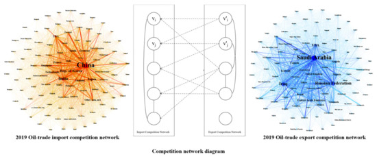 First, we construct an undirected weighted Crude Oil Competition Network (COCN). The COCN was built with the set of , in which the nodes represent the countries with crude oil import activities, as the network node of the import competition network; represents crude oil exporters, as the network node of the export competition network. represents the network competition edge, indicates the intensity of the competition between importers and importers , and the premise of importers and importers producing import competition is that they have a common source of imports that do not belong to the import competition network. The export competition relationship is the same. Both import and export competition relationships are expressed in Figure 1.