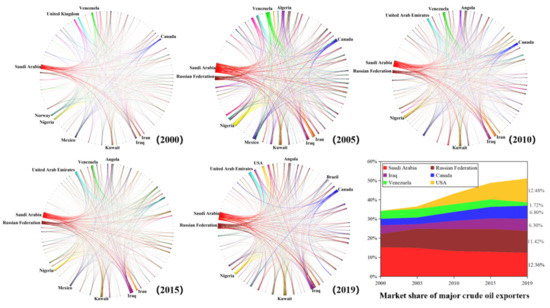 For a long time, the USA has maintained the strategic goal of “world oil hegemony”. As the country with the largest increase in crude oil export share and export competition intensity, the path of achieving the “world oil hegemony” has undergone a fundamental change. Before 2014, the USA guaranteed a sizeable crude oil supply through economic sanctions and intervention in the Middle East issue [46]. However, it was criticized by the international community. In 2014, the US shale oil production technology had a breakthrough innovation, officially lifted the 40-year ban on crude oil export, rapidly expanded the crude oil export, and began to transform into a prominent exporter of crude oil, trying to master the initiative in crude oil trade. Looking at the crude oil export market changes in the past 20 years, and the timeline of the crude oil events, we can suggest that the USA promoted the rapid evolution of the crude oil export competition pattern, which affected the major crude oil exporters. However, the specific reasons for the change in crude oil exporters cannot be generalized due to their different economic conditions, political positions, and changes in competition intensity.