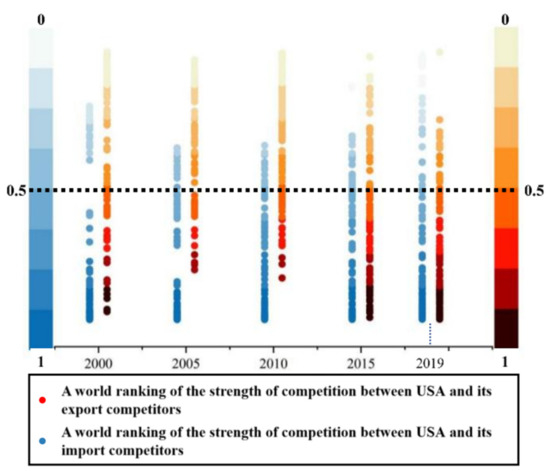 Therefore, whether it is the crude oil import competition network or the crude oil export competition network, the change in the USA alone is the greatest. Consequently, how important is USA in the oil trade competition? This study ranked the directly related competition of the USA by using the normalization method (Figure 5).