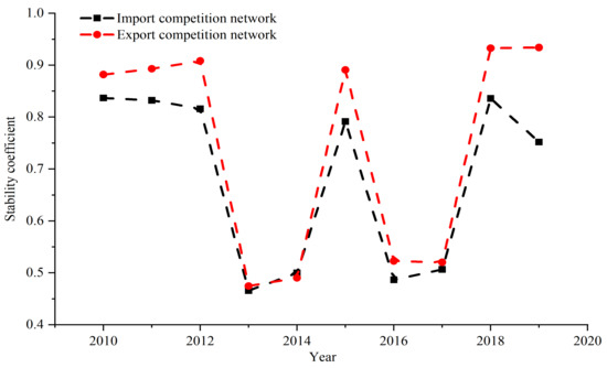 The stability coefficient is an essential factor in measuring a competitive network’s stability. We calculate the stability of the international crude oil import and export competition network for 2010–2019 using the autocorrelation function [36]. The calculation formula is shown in Equation (2).