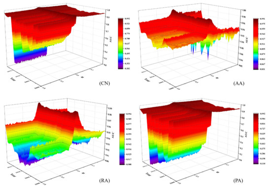 In the import competition network,is the common import competition country of importing country and , and is the competition intensity between importing country and the import competition country . According to the weak connection effect, weakly connected edges with smaller weight may have a greater contribution to the prediction of future connected edge generation. Therefore, we defined an exponentbased on the competition intensity, through the evaluation ofto determine the role of competition intensity in the future edge prediction. When , the competition intensity plays a full role in future edge prediction. When , the competition intensity does not play any role, and the competitive network is an undirected network without authority. When , the larger the competition intensity is, the smaller the contribution to edge prediction is. has the same meaning below.