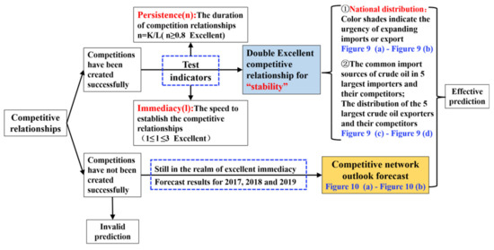 Figure 8 is a flow chart for the effectiveness test of crude oil competitions. The effectiveness test is based on the predicted and realized competitions as of 2019. The measures of prediction effectiveness are “immediacy” and “persistence”. “Immediacy” is defined as the speed to establish the competitive relationships: suppose that the annual distance between the year when the two countries first have a real competitive relationship and the forecast base year is L; if 1 ≤ L ≤ 3, the immediacy of the competitive relationship is excellent; if 4 ≤ L ≤ 10, then the immediacy is general; and if L ≥ 11, the immediacy of the competitive relationship is poor. “Persistence” is defined as the duration of competition relationships: suppose that the number of years in which a certain potential trade relationship appears in the future is K, and the number of all observation years is L, n = K/L. The continuity of the relationship is excellent if n ≥ 0.8, fair if 0.8 > n ≥ 0.5, and poor if n > 0.5. “Immediacy” is used to determine the speed of response when a potential competitive relationship becomes a reality. “Persistence” is used to determine the extent to which a potential competitive relationship is maintained once it becomes a reality. Competitive relationships that are slow to react and weak in persistence are generally caused by occasional political and economic factors, and are less relevant for research. Only those competitive relationships that are high in “immediacy” and high in “persistence” are “stable” and meaningful to explore.