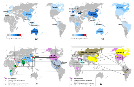 Figure 9c identifies the top five crude oil importers: China, Korea, Japan, India, the USA, and their import competitors. The new import competitors are located over long linear distances. Most typically, Korea’s new import competitors are all located in the Caribbean region. Their common source of imports is the USA. This means that Korea’s new import competitions have penetrated the intra-American crude oil trade market, almost regardless of geographical location. In fact, the additional import competitors of other major importers and their common sources of imports are also primarily distributed across continents.