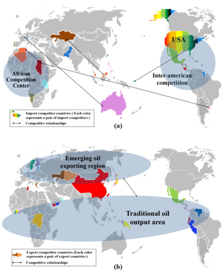 From the perspective of geopolitical and economic developments, we have analyzed the characteristics and causes of the crude oil import and export competitive evolution. However, what competitions have driven the evolution of the competition pattern? In this study, we collate the new and “stable” competitive relationships that have emerged over the last 20 years. It is found that the new relationships have certain patterns and characteristics. As crude oil has always involved politics and economics between major countries, this paper focuses on the competitive relationships between major exporters and importers that have been added and have the “stability” characteristics over the period 2000–2019, and we draw a general pattern.