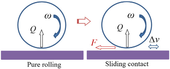 Once skidding occurs during bearing operation, the friction changes from rolling friction to sliding friction, as shown in Figure 1. When high sliding speeds develop due to cage slip, scuffing can be reached [34]. The sliding friction force is much larger and has an important effect on the vibration responses of the rolling-element bearing. It has a close relationship with the contact force and friction coefficient. To calculate the friction forces applied to the jth ball, sliding velocities at the contact surfaces of the inner and outer raceways are calculated first. The sliding velocities depend on the motions of bearing components. The velocities of contact points on each contact body can be determined according to the kinematical relationship as shown in Figure 2.