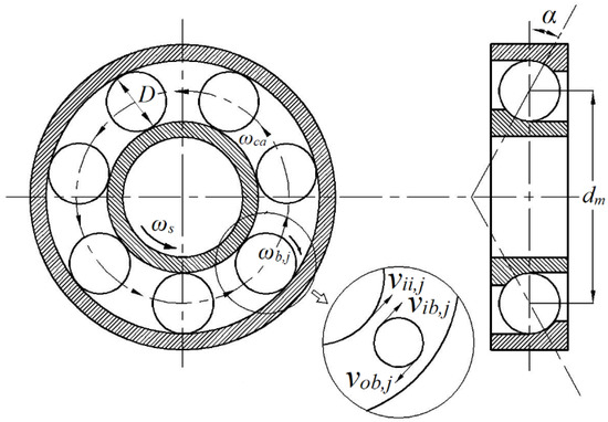 where ωb,j is the rotational speed of the jth ball; vii,j is the linear velocity of the inner raceway at the contact point with the jth ball; vib,j and vob,j are the linear velocities of the jth ball at the contact points with the inner raceway and outer raceway, respectively.