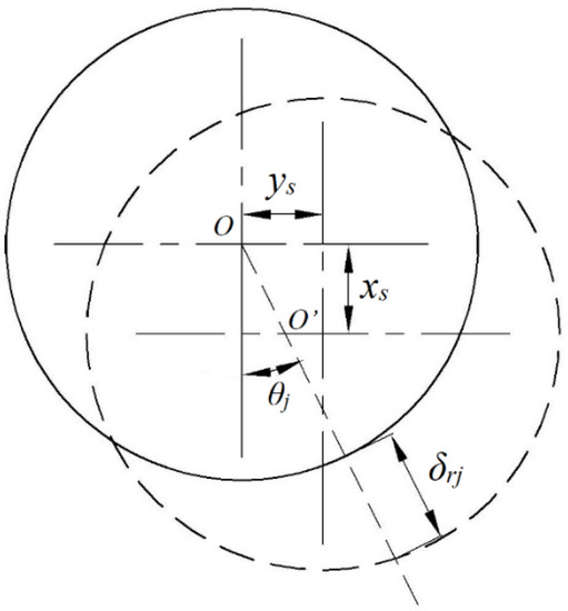 To calculate the contact deformations between the jth ball and raceways, the radial displacement of the inner raceway at the jth ball position was first determined. Figure 5 shows the positions of the inner raceway before and after loading. The displacements of the inner raceway along the x, y directions are xs, ys, respectively. The radial displacement of the inner raceway at the jth ball position is