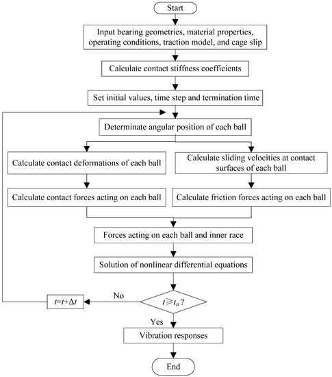 The dynamic model described above includes (2Nb + 2) differential equations for the bearing motion. The fourth-order Runge–Kutta algorithm with a constant time step (Δt = 1 × 10−5 s) was used to solve these equations. The solution process is shown in Figure 6. The bearing under investigation was a deep groove ball bearing (SKF 6304), and the parameters are given in Table 1. The initial displacements and velocities of the inner raceway were set to zero. Ball rotational speed obtained by simple kinematics was taken as its initial value.