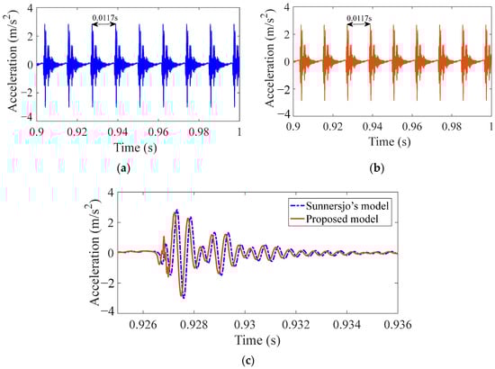 Acceleration of the inner raceway in the x-direction: (a) simulated vibration response by the Sunnersjo’s model; (b) simulated vibration response by the proposed model; (c) comparison of the two models in one period.