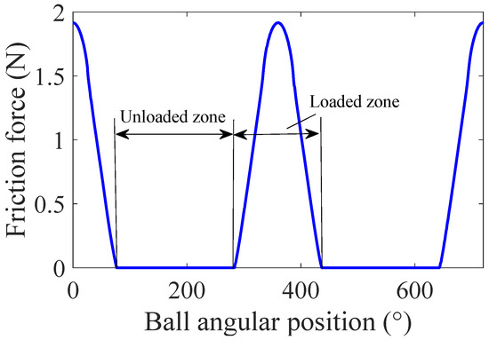 Friction force acting on the first ball versus angular position (ωs = 2000 rpm, W = 2000 N, sc = 2%, μm = 0.05).