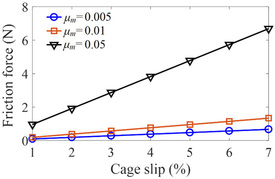 The effect of cage slip on the acceleration of the inner raceway is dominated by the friction forces between the inner raceway and balls. The friction force is mainly dependent on the contact force, friction coefficient, and sliding velocity at the contact surface. Figure 8 shows the friction force applied to the first ball changing with its angular position. It can be observed that the friction force applied to the ball mainly appears in the loaded zone, and the waveform is similar to that of the load distribution of bearing. The maximum values of the friction force under different friction coefficients and cage slips are shown in Figure 9. As shown in Figure 9, when the friction coefficient is fixed, the maximum value of the friction force increases with the cage slip. The reason for this phenomenon is that the sliding velocity increases with the cage slip, and the friction coefficient also increases, as shown in Figure 4. Moreover, it can also be seen that when the cage slip is fixed, the maximum value of the friction force increases with the friction coefficient.