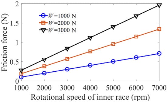 Figure 10 shows the maximum values of the friction forces under different rotational speeds of inner raceway and radial loads. It is found that the maximum friction force increases with the radial load. This is because the contact force applied to the ball increases with the radial load. In addition, the maximum friction force increases with the inner raceway speed. This can be attributed to the large sliding velocity when the raceway speed is high, as shown in equation (Equation (7)).