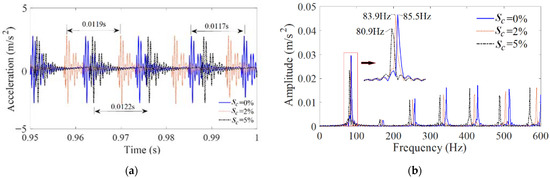 With the proposed model, the bearing vibration response was simulated and analyzed. The acceleration responses and their spectrums under different cage slips are illustrated in Figure 11. The most obvious change caused by the cage slip is the time interval between two adjacent cycles or the ball passing the outer raceway frequency (fbpo). The ball passing the outer raceway frequency under the situation of no cage slip (85.5 Hz) is equal to the value determined by the calculation method in ref. [33]. The ball passing of the outer raceway frequency decreases with the cage slip. The correlation between the ball passing the outer raceway frequency and cage slip meets the following rule: