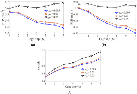 Effect of cage sip on statistical indicators of the acceleration of the inner raceway under different friction coefficients (W = 2000 N, ωs = 2000 rpm): (a) PTP value; (b) RMS value; (c) kurtosis value.