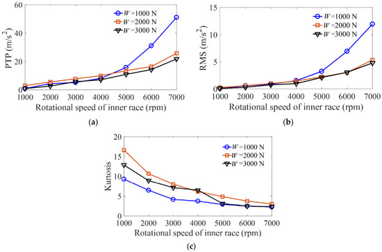 Effect of rotational speed on statistical indicators of the acceleration of the inner raceway under different radial loads W (sc = 2%, μm = 0.01): (a) PTP value; (b) RMS value; (c) kurtosis value.