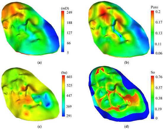 Basic properties of Baoshaceng reservoir: (a) Permeability distribution, (b) Porosity distribution, (c) Pressure distribution, (d) Oil saturation distribution.