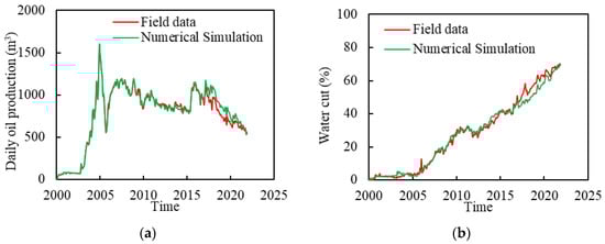 Production history of the Baoshaceng reservoir. (a) Daily oil production history fitting. (b) Water cut history fitting.