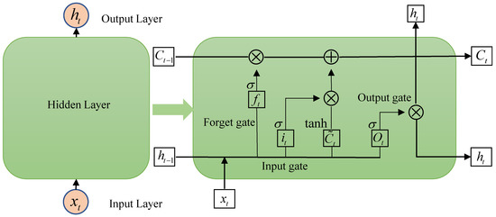 Long Short-Term Memory (LSTM) networks are popular neural models that are used for learning and predicting long-term dependencies. An LSTM network typically consists of an input layer, a hidden layer and an output layer. The hidden layer, which is also referred to as the memory unit, controls the long-distance temporal information transmission. The memory unit consists of three gate calculation structures, namely the “input gate”, “forget gate” and “output gate” (Figure 3). The “input gate” is used for inputting and filtering new information. The “forget gate” is the most important controlling mechanism of an LSTM, discarding the useless information and retaining the useful information. The “output gate” enables the memory cell to output only information relevant to the current time step. These three gate structures perform operations such as matrix multiplication and nonlinear summation in the memory unit so that the memory information will not disappear in continuous iterations (i.e., the issue of gradient disappearance can be effectively resolved) [19,20,21].